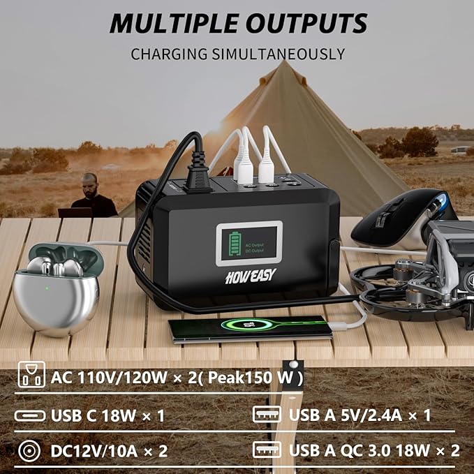 - 8 Output Ports:Portable power bank has 8 Outputs ports, 2 USB 3.0 18W max QC ports, 1 USB 5V 2.4A ports, 1 USB C port 18W max, 2 DC ports 12V 10A max, 2 pole and 3 pole output sockets with 120W running (150W peak). Powers mobile phones, iPads, laptops, tablets, cameras, radios, USB powered night lights, mini fans under 120W