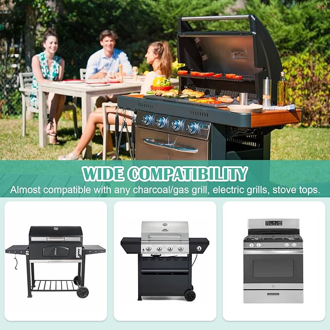 - ► Wide Compatibility - This cast iron griddle plate is almost compatible with any charcoal/gas grill, electric grills, stove tops. Whether it's camping, tailgating, or hosting backyard parties. With this flat-top griddle pan, you can enjoy restaurant-quality barbecue wherever you go.