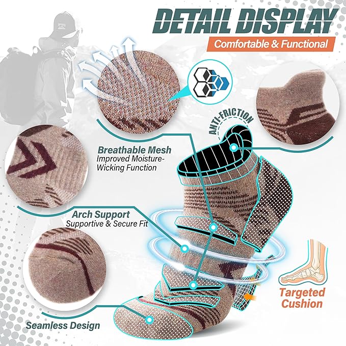 • ๐Ÿƒ PROTECTION FOR FEET : High stretchy fabric keeps socks fit snugly and prevents slipping.Targeted cushioning has better shock absorption, which can reduces the foot soreness and provides more protection for Achilles.Engineered heel and seamless toe do not grind your feet and avoid blisters , providing the most comprehensive protection for your feet.