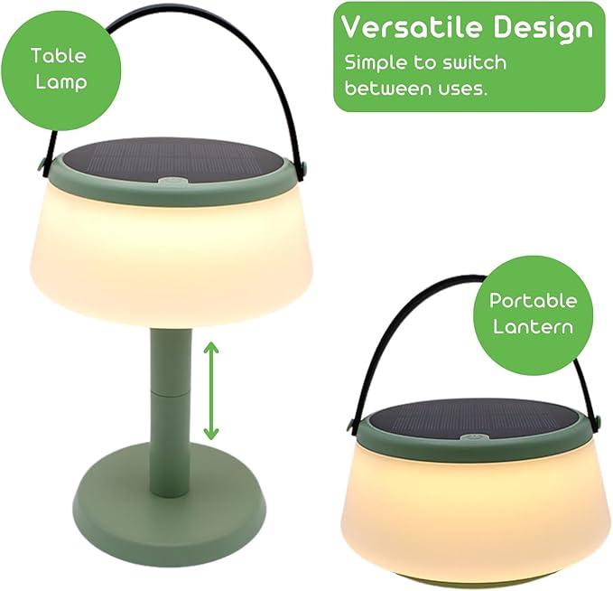 2-in-1 Portable Solar Power LED Table Lamp & Lantern - Indoor/Outdoor - Stepless Dimming - Rechargeable Battery - 330 lumens, 2700K - IP44 Weather Resistant - Green