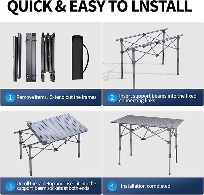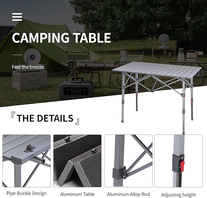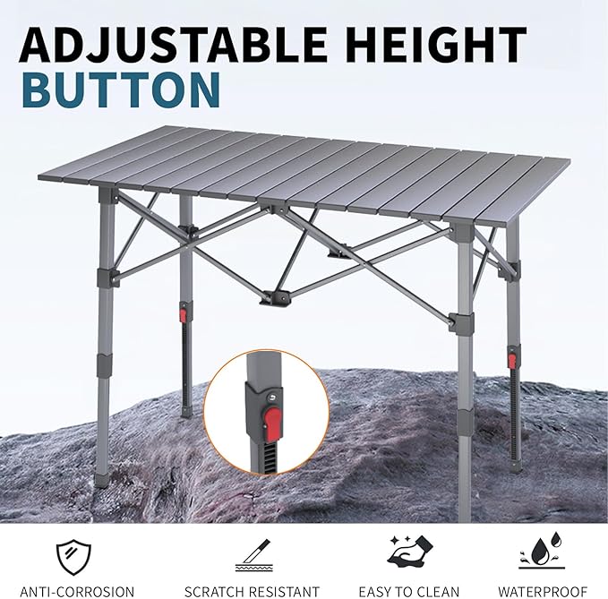 - Robust Construction: The camping table supports up to 100 pounds, equipped with excellent water-resistant, rust-proof, scratch-resistant, and stain-resistant properties. Ideal for disinfecting with quick wipe-cleaning and rinse, making it perfect for use as a cooking or dining table outdoors. The table offers adjustable height to suit both standing and sitting, providing ample space to comfortably accommodate up to six adults.