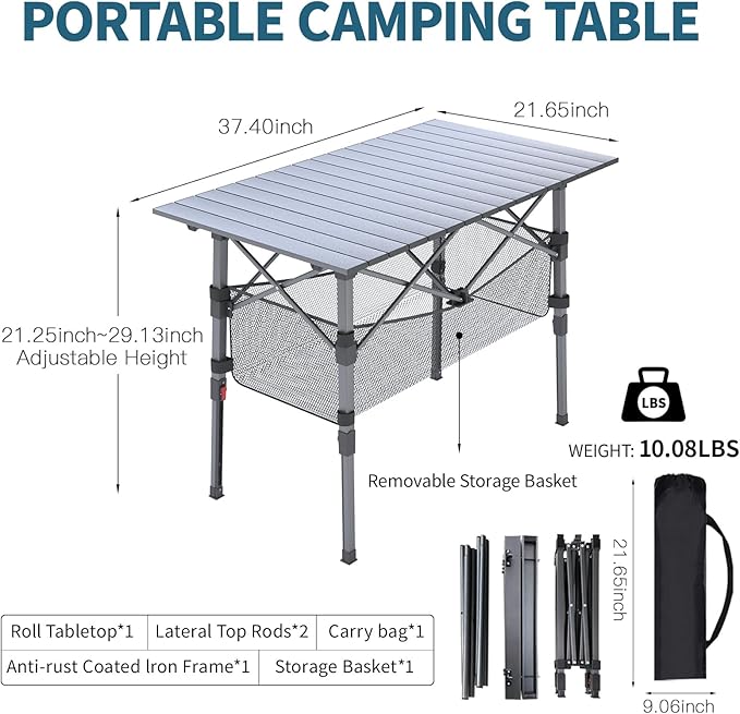 Portable Camping Table with Adjustable Height Legs, Lightweight Aluminum Roll-up beach tables for sand foldable,Folding Picnic Table Large Storage Basket for Outdoor camping (Black, Medium 37")