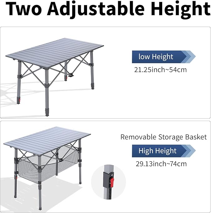 - Adjustable Height: Independently adjust the legs to accommodate uneven terrain; our camping table features an adjustable height design with 4 extendable legs, allowing you to set the height from 21 inches to 29 inches. This ensures the table remains stable on any surface, meeting your various needs.