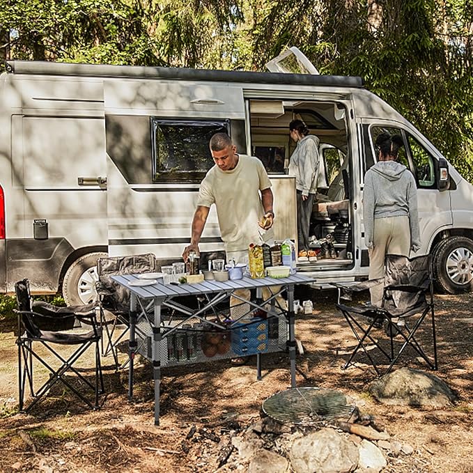 - Large Storage Capacity: Incorporate a spacious storage mesh basket under the camping table for easy storage of toys, bags, snacks, beverages, and small kitchen tools. The basket is easily removable when not in use.