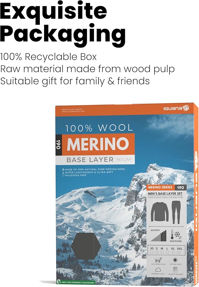 Iguana Mens 100% Merino Wool Base Layer Sets for Ski Lightweight Thermal Underwear