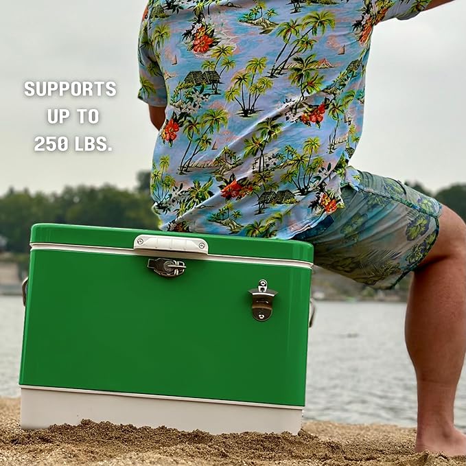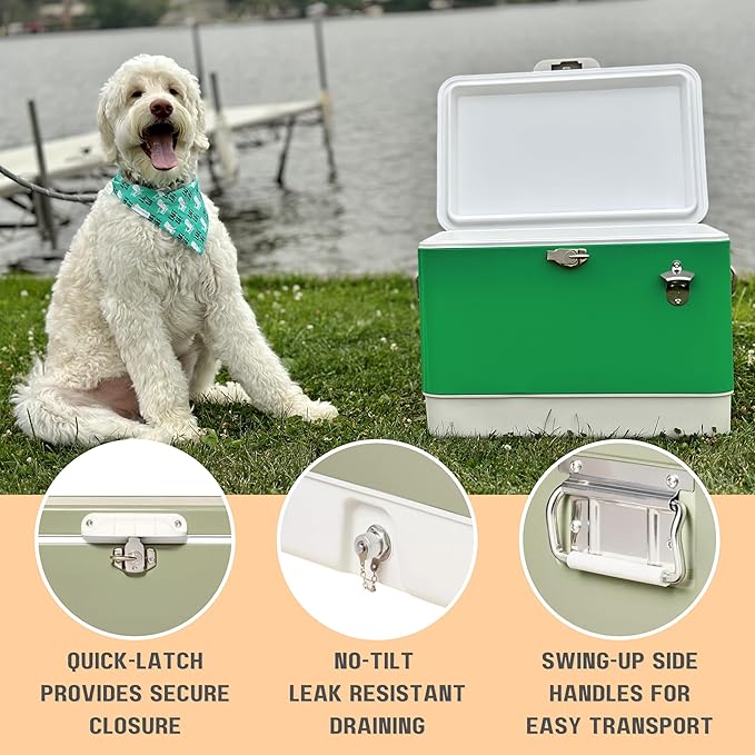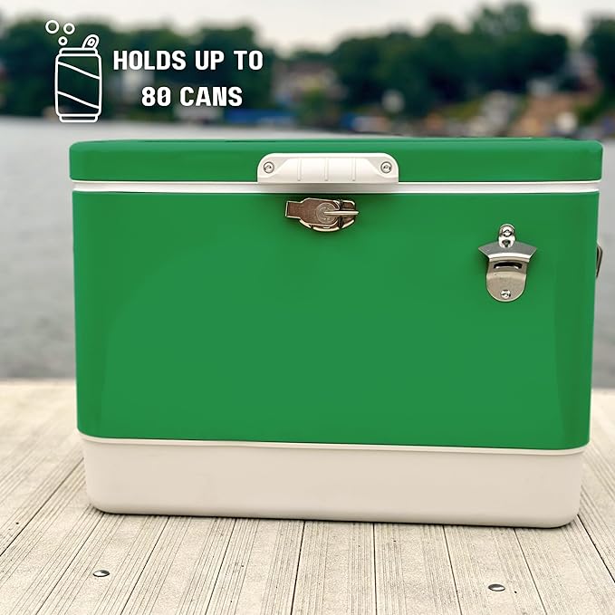 - TIMELESS STYLE: Featuring a two-tone shamrock green and cream design, this hard-sided cooler adds a touch of retro charm to your outings. Elevate your outdoor experience with a metal cooler that not only performs but also looks good doing it.