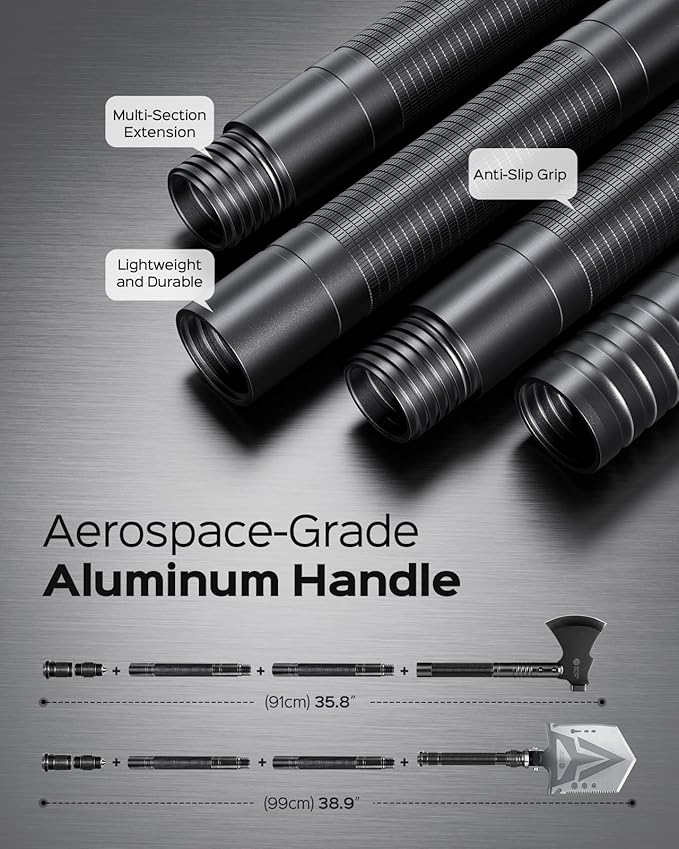 - MILITARY GRADE AXE AND FOLDING SHOVEL: Built to last, the axe and collapsible shovel are constructed from high hardness carbon steel, ensuring they are rust proof, wear resistant, sharp, and sturdy. The extended handle is made from thickened aviation grade aluminum, offering lightweight durability and a comfortable grip. The foldable portable shovel length can be adjusted from 16.5 inches to 38.9 inches. Includes a whetstone for sharpening