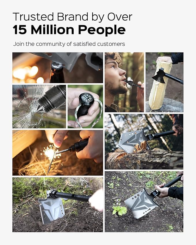 - VERSATILE APPLICATIONS: The tactical shovel includes an axe, shovel, compass, whistle, pliers, knife, hammer, screwdriver head, flint, whetstone, flashlight with USB C charging cable, paracord, 4 extension handles, 2 nylon covers, and a toolbox. Ideal for camping, hiking, off-roading, and emergencies