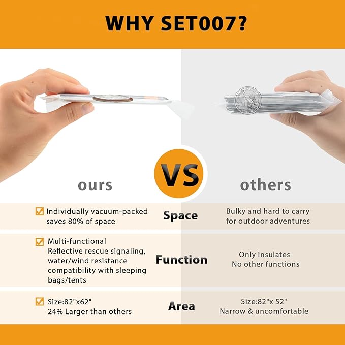 - Enhanced Dimensions and Robustness: The SET007 emergency mylar blankets measure a generous 82"x62", which is 24% larger than typical Mylar blankets. At a thickness of 12μm, they are not only thicker but also more robust, ensuring superior coverage and enhanced heat retention ability.