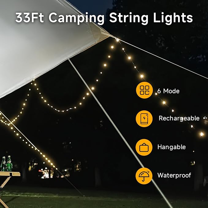 Camping String Lights Rechargeable - 33Ft Quick Storage Portable Tent Lights with 6 Modes, Battery Operated Waterproof Hanging LED Lamp for Patio Garden Party Camping Essentials