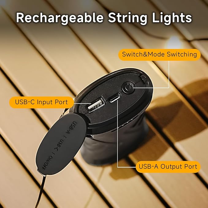 - USB Rechargeable: Battery powered string lights come with a 1200mAh battery, offering extended use from 5 to 20 hours. With USB-C fast charging, you can quickly recharge by connecting to any USB port