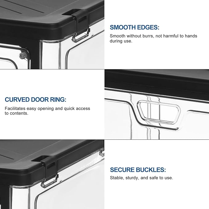 - 【Durable & Stackable】The plastic storage bins with lids are crafted from premium, sturdy, and heavy-duty materials, ensuring durability. The groove design on these foldable storage boxes allows them to stack up securely without tipping over. When not in use, these collapsible bins can be folded up and tucked away under the sofa or in an RV.