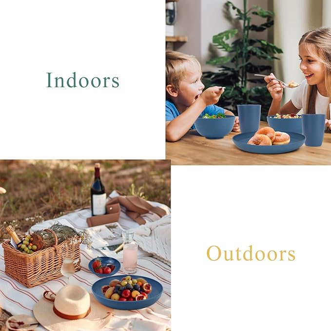 Wheat straw plates and bowls sets of 16 - Unbreakable wheat straw dinnerware sets for camping - Alternative plastic dinnerware set service for 4 - Microwave safe and Dishwasher safe bowls. Blue