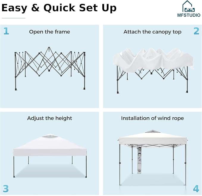 MFSTUDIO 10x10 Pop Up Canopy Tent, Outdoor Tent One Push Setup Instant Portable Shelter Canopies with Vented Top, Straight Legs, Wheeled Bag, 4 Sandbags, White