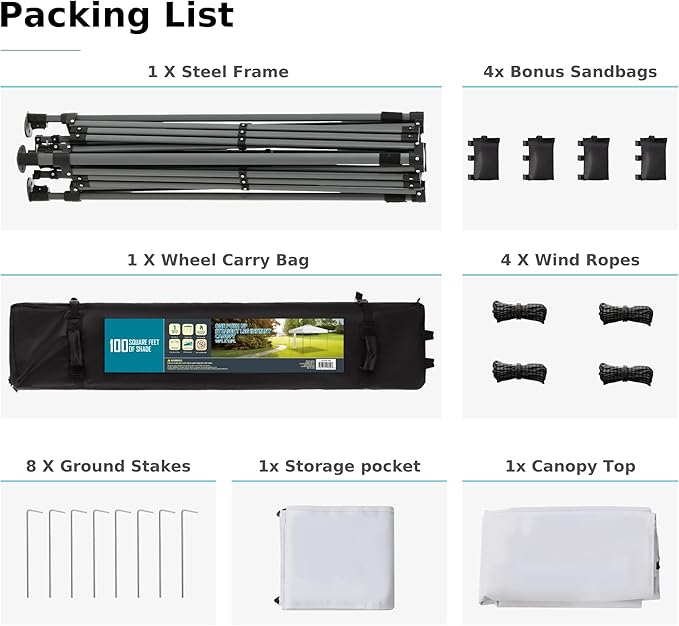 - Comprehensive Accessory Kit: This pop-up canopy includes 1 wheeled carry bag, 1 Storage Bag, 4 bonus sandbags, 4 wind ropes, 8 ground stakes. This comprehensive package gives you everything you need for a stress-free and enjoyable outdoor experience