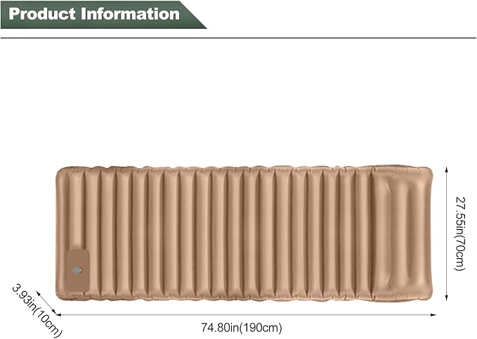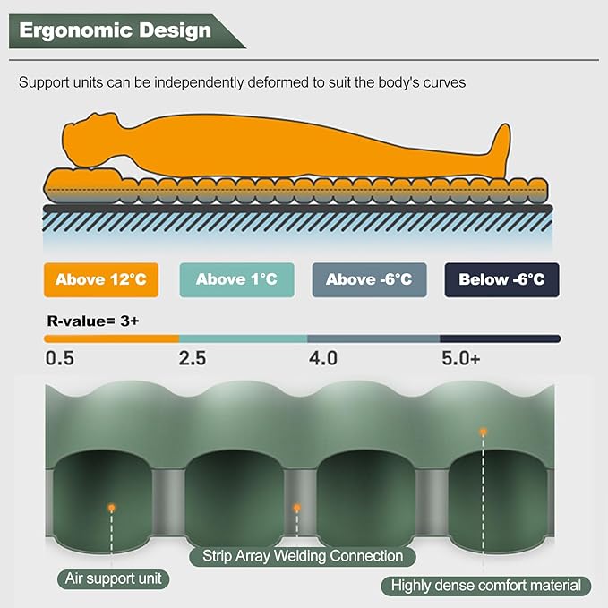 - 【Durable and comfortable mattress】 The new creative inflatable mattress adopts ergonomic design. It is in line with ergonomics to support all pressure points, air support units, strip array welding connections, high -density and comfortable materials, which can keep your body away from uneven ground and hard rocks, ensuring the maximum comfort and warmth.