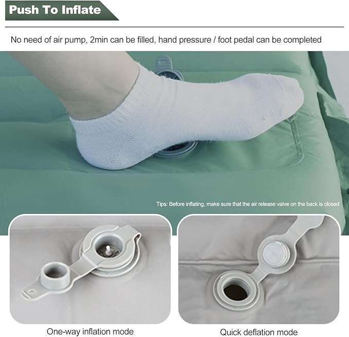 - 【Footsteps press and inflatable】 Use our camping sleeping pad, just press your feet to be pressed on the inner pump to inflation in 2 minutes. deflate is also a simple thing, just open the bottom cover and press the air cushion. You can easily deflate, (Before inflating, make sure that all air outlet valves have been closed, and all the air valves are closed after inflating.)