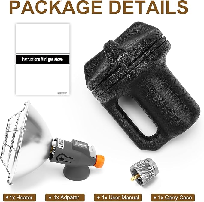 - 【Equipped With Portable Packaging】-The camping heater comes with a small, portable storage case that can fit the whole thing. The storage case is made of nylon and ABS, which are sturdy and lightweight and take up little space. It's perfect for outdoor campers. The storage case has a handle on top, so it's easy to carry and move around.