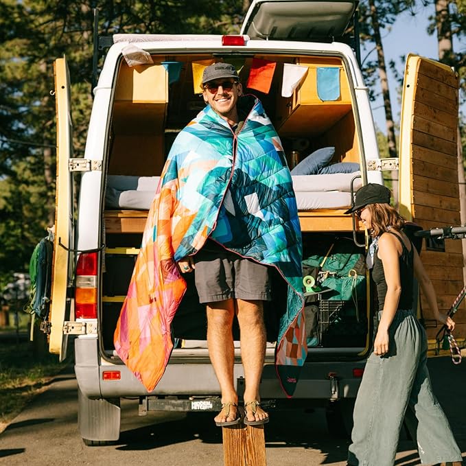 - Yellowstone National Park-themed insulated puffer blanket features technical materials found in premium sleeping bags and jackets; designed for camping, hiking, travel, picnics, beach days, and more
