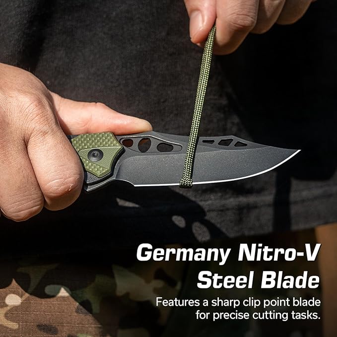 - Germany Nitro-V Blade: This folding pocket knife features germany Nitro-V stainless steel, with exceptional edge retention, high toughness and corrosion resistance to meet the performance requirements of everyday precision cutting tasks