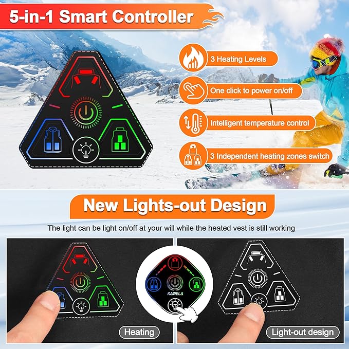 - 5 IN 1 SMART CONTROLLER: The electric vest for men upgraded with intelligent one-button temperature control with 3 independent heating zones and 3 heating levels help you adjust the perfect temperature for different areas! With special Light out design, the controller's light can be light on / off as you wish.