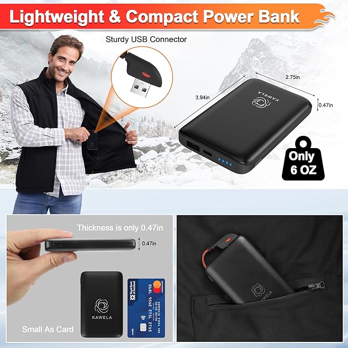 - FULLY EQUIPPED: The heated vest with battery pack comes with a 6oz 10000mAh battery and Type-C charging cable for easy and fast charging. Includes a bonus portable storage bag and laundry bag for easy carrying, cleaning and maintenance.Don't let the cold weather hold you back. Stay warm, comfortable, and stylish with our heat Vest. It's an ideal Thanksgiving Christmas Birthday gift for men.