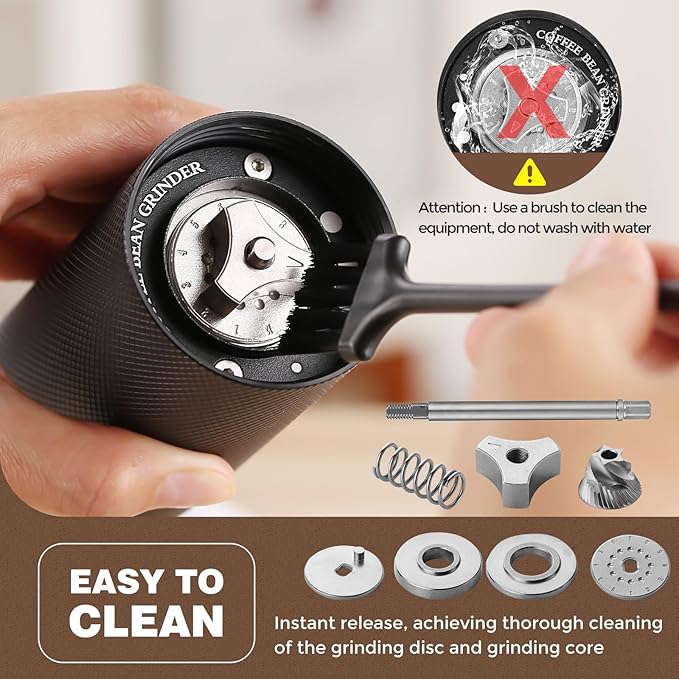 - EASY TO DISASSEMBLE & CLEAN: Warmthmaster hand coffee grinder does not require any tools and can be easily rotated to separate the components. When cleaning, simply use the included brush to brush off any remaining coffee powder inside. This function not only ensures the service life of the grinder, but also prevents the accumulation of oil and residues over time, thereby helping to improve the purity of coffee flavor. But please note, do not rinse with water.