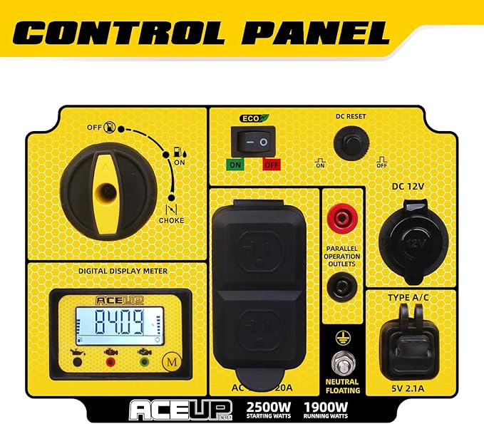 - Parallel ready allowing connection of two inverter generators to double the power output (parallel kit sold separately); Equipped with Eco Mode, one 120V 5-20R 20A outlet, one 12V 8.3A DC car charger outlet, and USB Type A/C ports