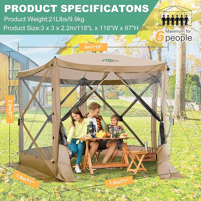 COBIZI 10x10ft Pop up Gazebo Screen House Tent for Camping, Pop-up Camping Canopy with Mesh Windows,Portable Outdoor Quick-Set Hub Tent with Carrying Bag&Ground Stakes,Khaki(Upgraded 2.0)