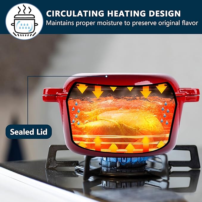 - GOOD HEAT CONDUCTION & RETENTION: Cast iron ovens have good thermal conductivity and evenly distributed heat in the pot; Covering a closed pot lid can prevent water loss from maintaining the original flavor of the food; Cast iron pot also has good thermal insulation performance, Making the food insulation time longer, Allowing you and your family to enjoy a good meal