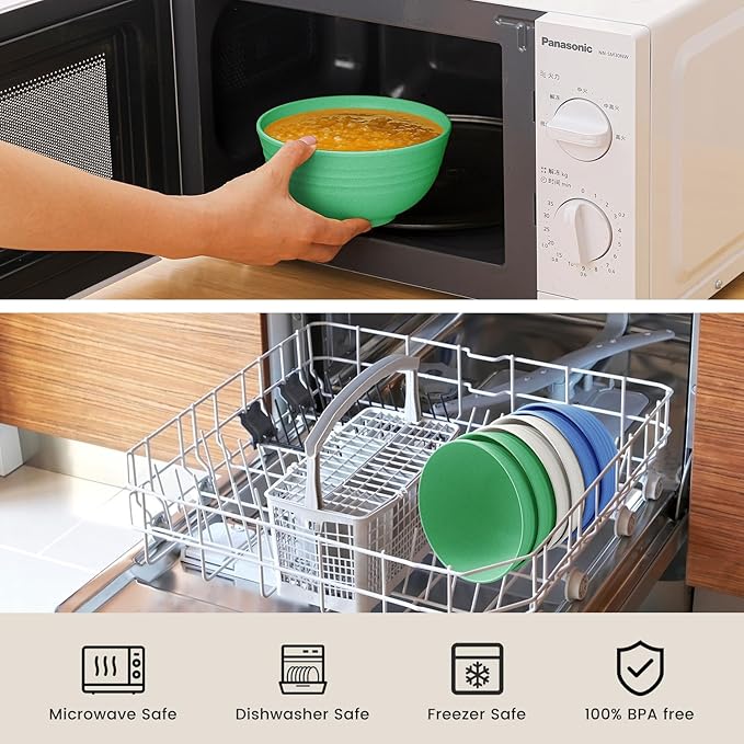 - 【Microwave Safe and Freezer Safe】Our soup bowls, crafted from high-quality wheat straw,offer the perfect blend of beauty,functionality and sustainability.They are designed to be used in both microwave safe and freezer safe.Whether you are reheating leftovers, defrosting frozen foods, or even storing your meals for later consumption, our wheat straw bowl set are up to the task.Note:The microwave temperature resistance reaches up to 248 degrees Fahrenheit(120℃)