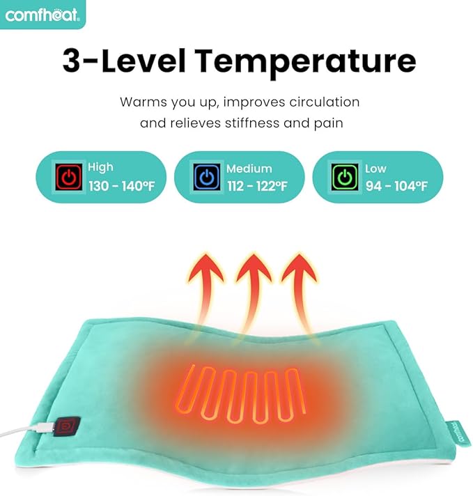 - 3 HEATING LEVELS & AUTO OFF: High temperature (130 - 140℉), medium temperature (112 - 122℉), and low temperature (100 - 104℉); Built-in intelligent control chip to ensure stable heating and prevent overheating; 45 mins auto-off, safety, and energy saving