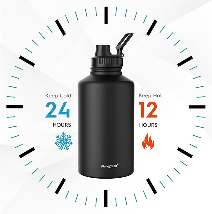 Navigate 64 oz Stainless Steel Insulated Water Bottle,Double Walled Leak Proof Keep Cold for 24 Hrs Hot for 12 Hrs,Wide Mouth Water Jug with Spout & Handle Lids,Black