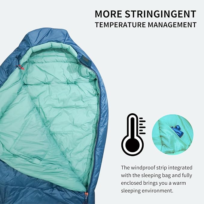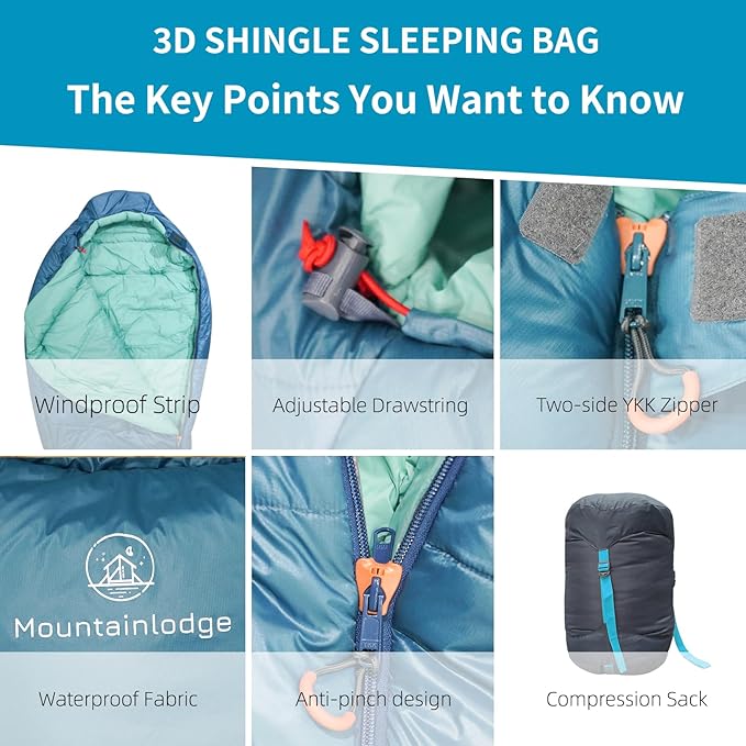 - 【Distinctive Design and Craftsmanship】- Mountainlodge camping ultralight sleeping bag differs from other sleeping bags in that it not only has two sides, but also has obvious sides.This means that this sleeping bag has a more three-dimensional sense of wrapping, larger space, and a more comfortable experience.And the process called shingle also allows sleeping bags to be used in colder environments.