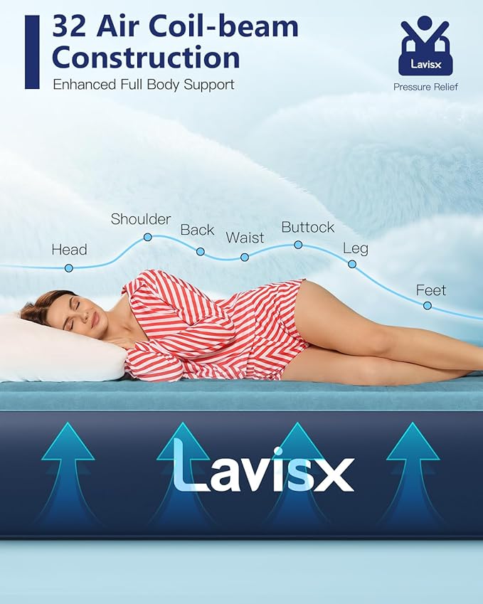 - Advanced Support System - Featuring an innovative coil structure, our inflatable mattress delivers superior support and comfort. The carefully designed 32-coil system, allowing you to sleep more naturally and wake up refreshed.