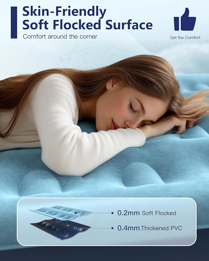 - Luxury Soft Touch - Crafted from premium flocked material, the surface of our air mattress is gentle on the skin. With its waterproof and stain-resistant properties, this air bed combines durability with comfort for a restful night's sleep.