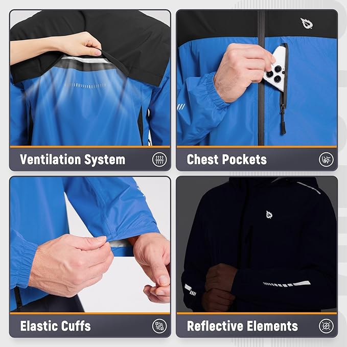 • Packable Hood: Mens cycling rain jackets with hood features drawstring, large enough to accommodate road riding and climbing helmets. The hood can be tucked into a velcro compartment by the collar when not in use.