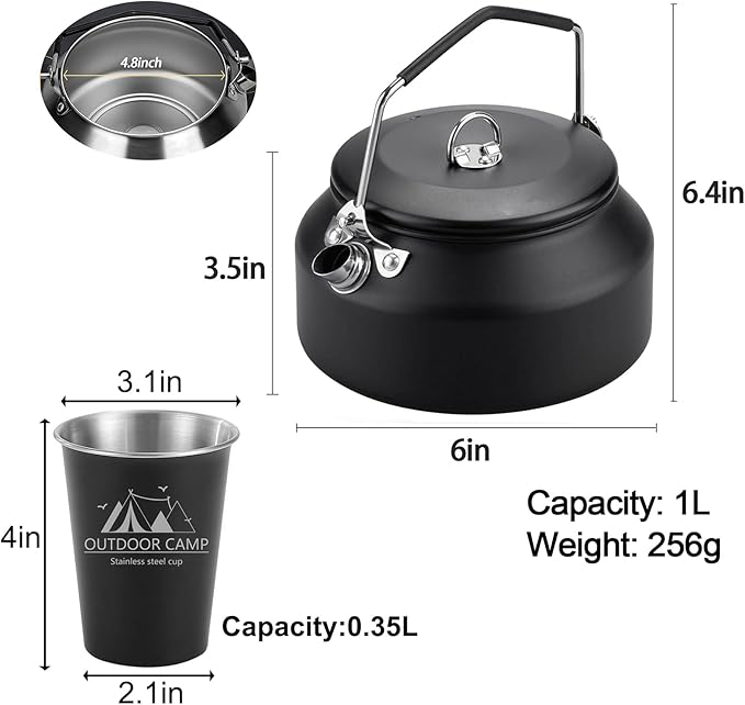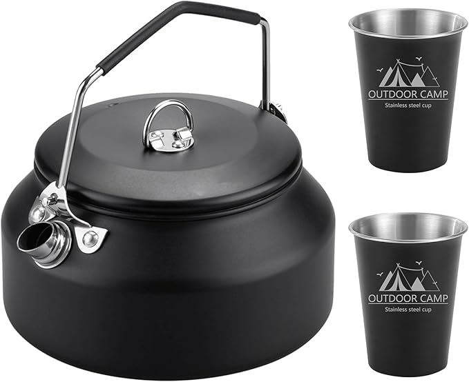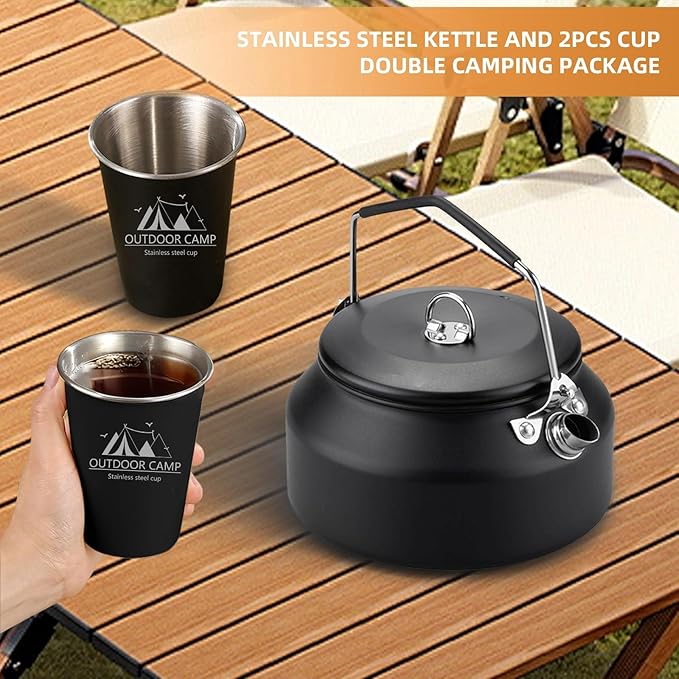 - ☕【FAST HEATING】Our camping kettle can be used on an open fire and induction cooker. The metal bottom has high thermal conductivity for more uniform heating, allowing you to boil water in just 3 to 5 minutes. Enjoy your steaming hot cup of coffee or tea quickly and easily with the included cups.