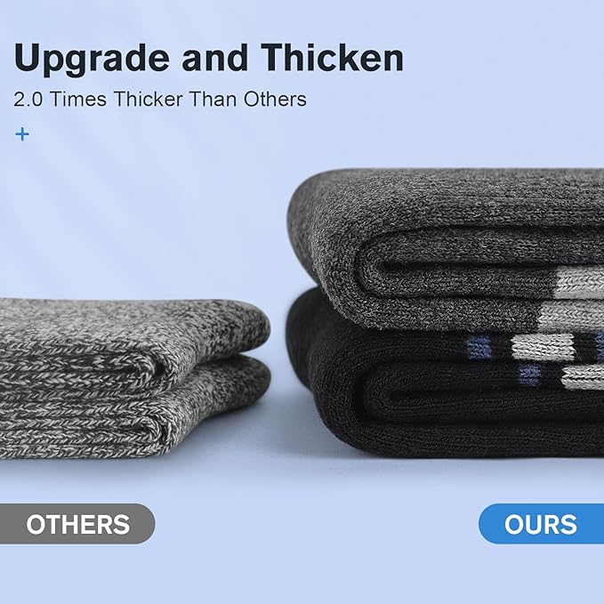 - [ THICKER AND WARMER ] With a thickened design and towel knitting technology, these womens hiking socks overperform the thermal performance with full cushioning. Each pair functions like a personal heater, enveloping your feet in cozy warmth from morning till night, perfect for the coldest winter days.