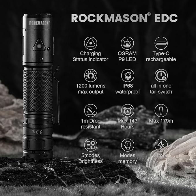 - Super Bright: ROCKMASON RM-F3 is a small but powerful EDC flashlight, equipped with a Germany imported P9 LED, through special TIR Lens, it unleashes a stunning 1200 lumens of brightness.