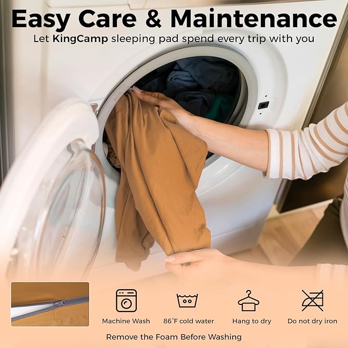 - REMOVABLE & MACHINE WASHABLE COVER – Designed for convenience and hygiene, the outer cover can be easily removed and tossed into the washing machine. No need to worry about dirt, sweat, or spills—your camping mattress stays fresh and clean, ready for your next adventure.