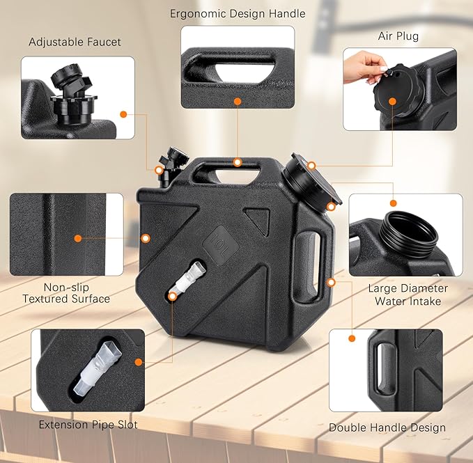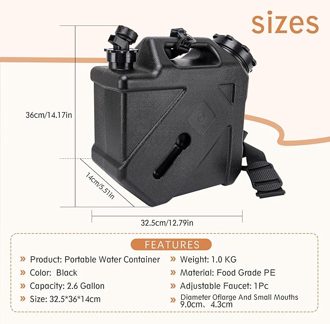 - STURDY, FOOD GRADE PE MATERIAL: Our 2.6 gallon water container with spigot is made of PE plastic food grade plastic. BPA, PVC free. It ensures your water stays clean and safe to drink. Thickened camp water container wall, non-slip, scratch-resistant, anti-collision, not easy to wear, long-lasting and sturdy, can withstand harsh outdoor conditions, suitable for long-term storage or daily use