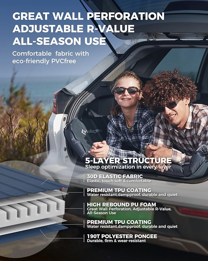 - HIGH R-VALUE 7.1/7.9 FOR 4-SEASON INSULATION: This innovative double-sided sleeping pad features two R-values: 7.1 on one side for warm-weather camping and 7.9 on the other for winter insulation. The higher R-value side offers extra warmth and protection from the cold ground during chilly nights in fall or winter, while the lower R-value side ensures breathable comfort during summer nights. Perfect for year-round outdoor adventures, this pad keeps you cozy in any season.