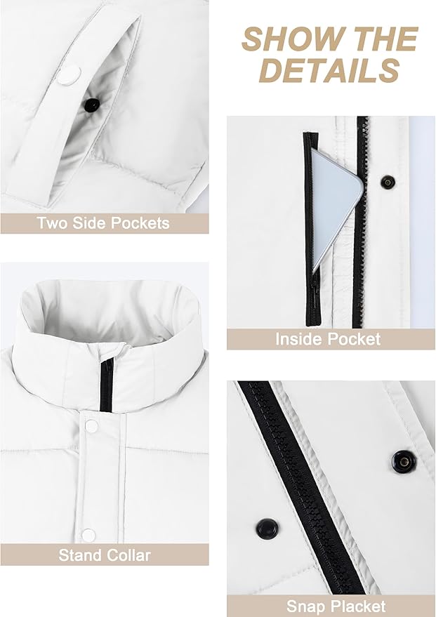 • Feature: Women winter crop vest, snap-button closures, Stand-up Collar, Sleeveless, 2 sides pockets, interior pockets, and the cropped puffer vest made of waterproof and windproof fabric.