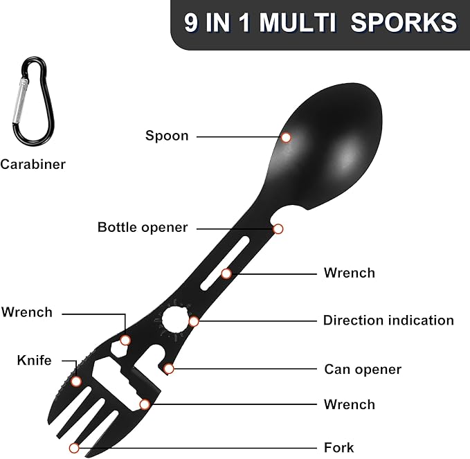 - Multi-functional Camping Sporks - Made of stainless steel, it can be a spoon, fork, bottle opener, can opener, or positioning wrench which will add more functions to your camping travel and feature a hole to attach it to a backpack with a keychain for portability