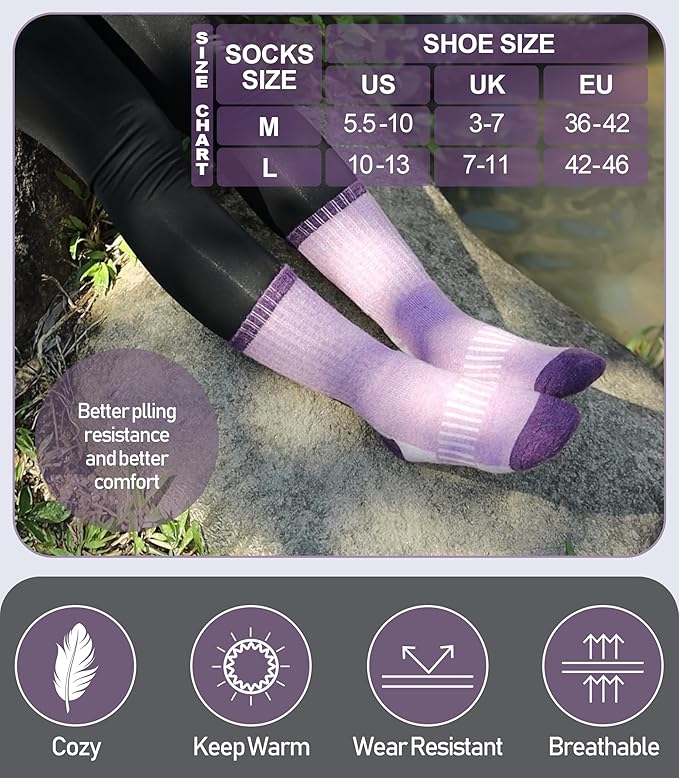 - TWO SIZE OPTIONS - DYW merino wool hiking socks have 2 sizes as options, Medium & Large .Medium Size fits for US women’s shoe size 5.5-10.Large Size fits for US women’s shoe size 10-13. A package includes 5 pairs womens warm socks at a value price.The value package with fashion colors are most women’s favorite.