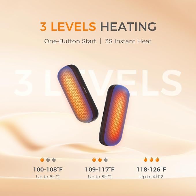 - ๐Instant Heat, Lasting Warmth: Heat release in just 3 Seconds, 3 temperature settings up to 126 ยฐF, Heat duration up to 4 to 6 hours; We offer a split USB-C charging cable, saving you charging time and allowing you to enjoy more warmth