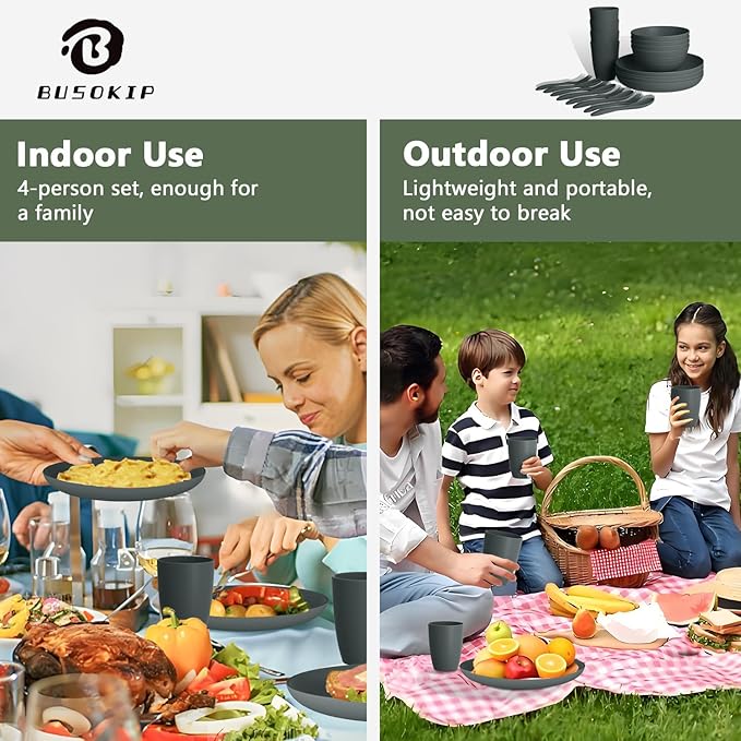 - 【Dinnerware Sets】 BUSOKIP 20 pieces wheat straw dinnerware sets include 9'' plates x 4, 26 oz bowls x 4, 12 oz cups x 4, forks and spoons x 4. The color is dark grey. The dishes set for 4 is suitable for the dining need of 4 people. A simple but compact dinnerware set great for everyday meals at home, school, office, camping or traveling.