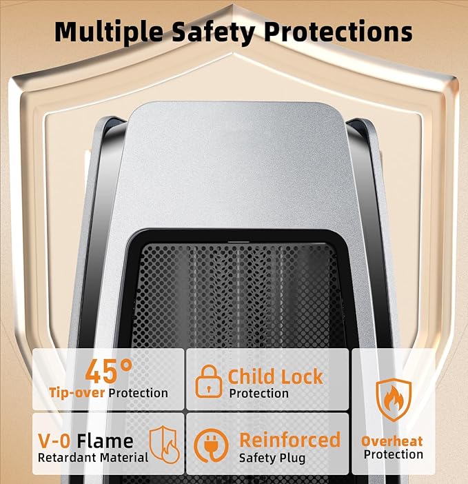 - 【Safety Features That Guard Your Haven】 Sleep soundly knowing your home is protected by an electric space heater for indoor use that's as vigilant as it is warm. From tip-over protection to overheat prevention, and with V0 flame retardant materials, our room heater is a fortress of safety, complete with a child lock for added peace of mind.