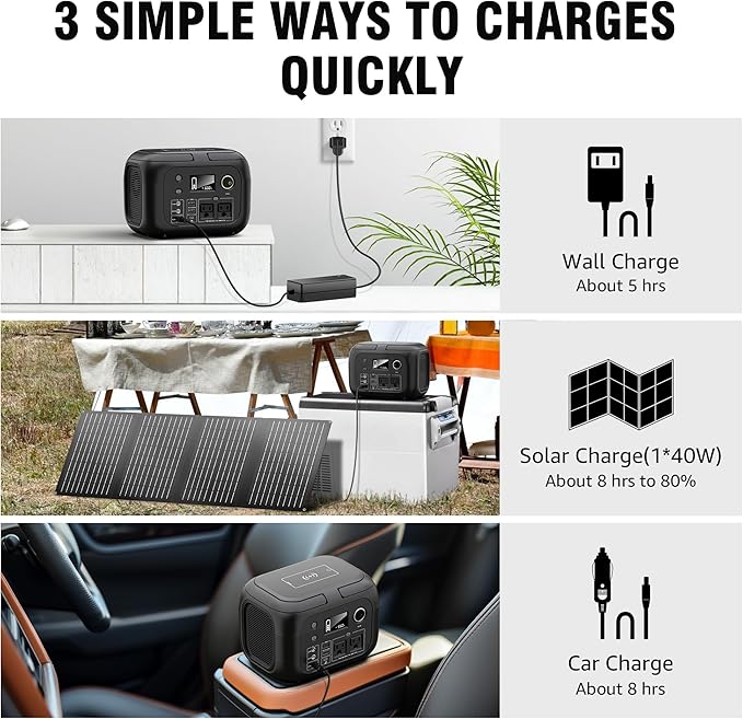 - 【Warm Tips】The portable generator performance is maintained by charging and discharging, Not charging for a long time may cause the unit to enter protection state, more than 300W power devices will cause the portable generator unavailable, please don't use up the unit's power, keep the battery capacity at 60%-80% (Equipped with SOS light feature, you can use it in case of an emergency)